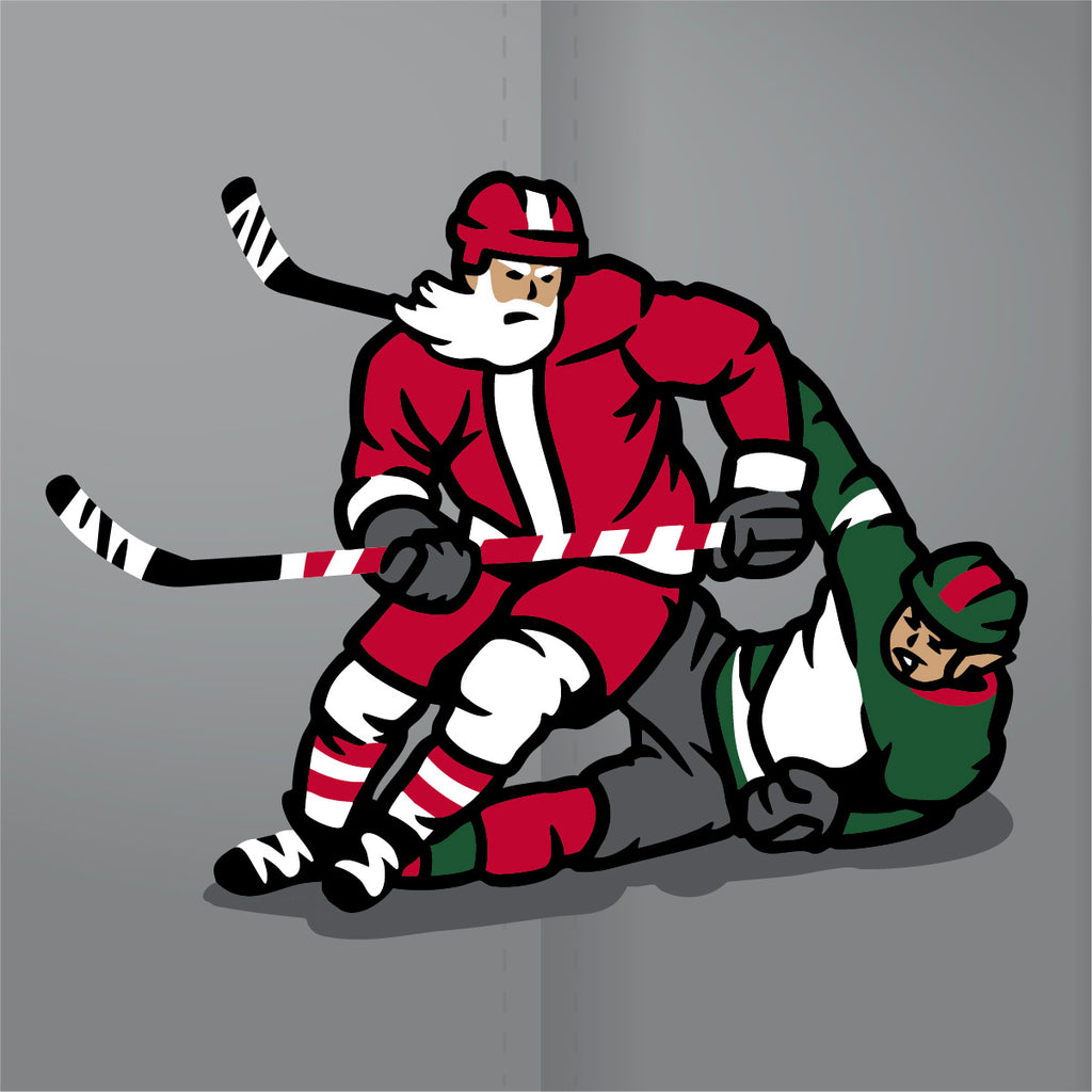The Sleighers vs the Little Helpers in the annual North Pole Classic. Santa’s never been the finesse skater. He’s the blueliner that stretches the jersey and clears out the crease. He’s got his list out and is checking off names.